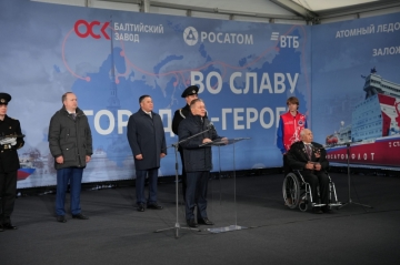 В режиме видеоконференции на торжественной церемонии выступил Андрей Бочаров, а капсулу с землей Мамаева кургана Алексею Лихачеву передал Павел Винокуров. Он отметил: «Пусть этот мощный ледокол, носящий имя нашего величайшего сражения, так же стойко и мужественно прокладывает путь во льдах, как наши солдаты шли к Победе. Держите курс! И помните – за вами Россия!»
